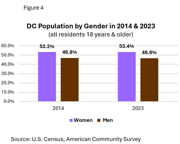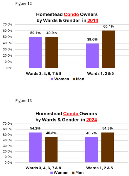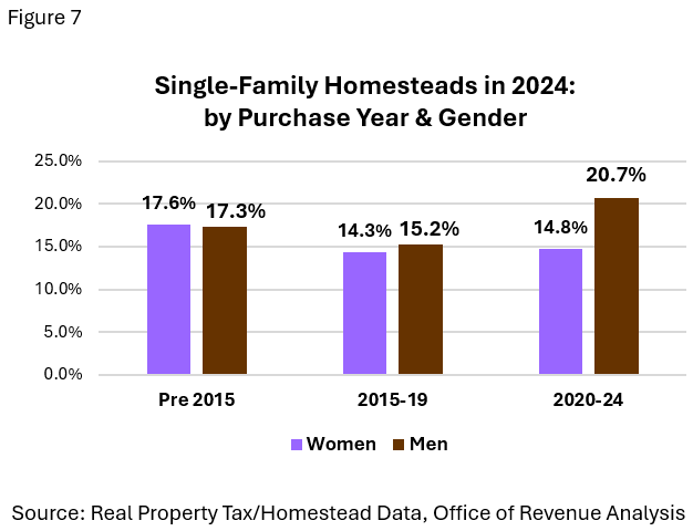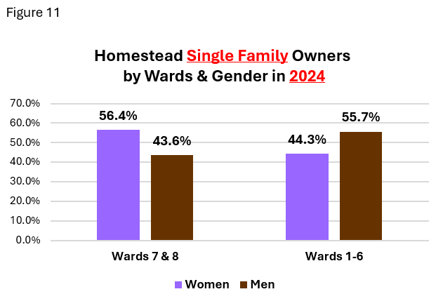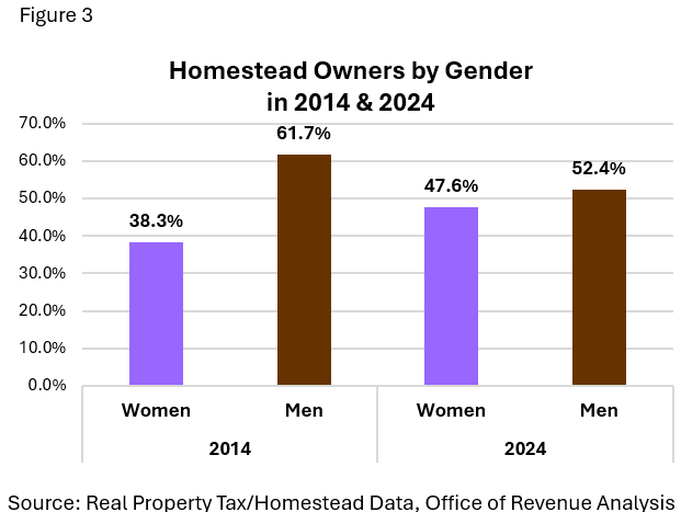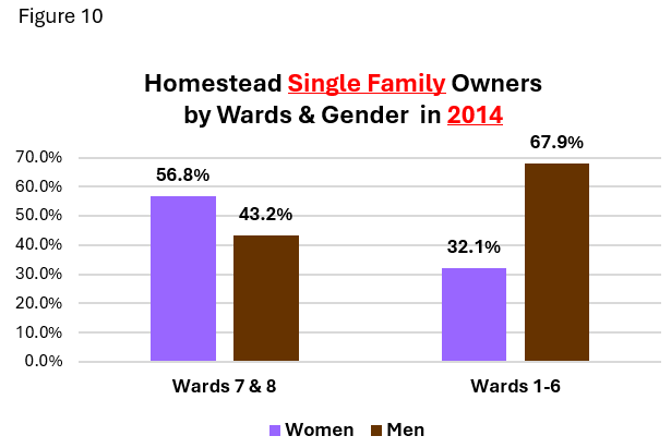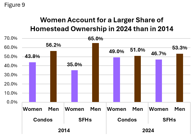 Figure 9 compares DC home ownership in 2014 and 2024. In 2024, women owned 49 percent of the city’s condominium homesteads, up from 43.8 percent in 2014. Similarly, women owned 46.7 percent of single-family homes in 2024, compared to only 35 percent in 2014.
