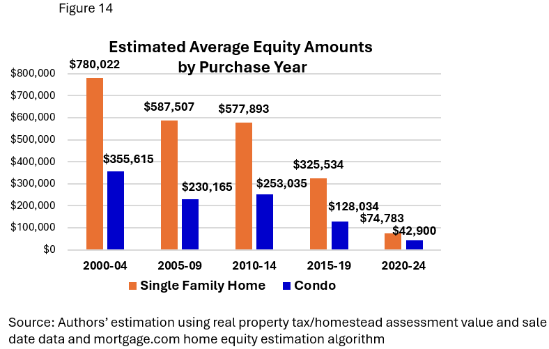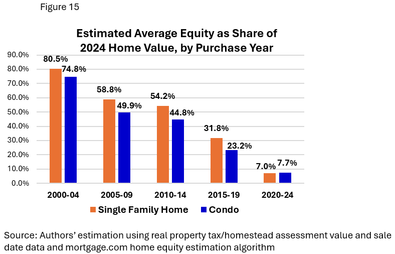 Home Equity amounts were estimated using the website https://www.mortgagecalculator.org/calculators/mortgage-principal-calculator.php . The website allows for the estimation of the remaining principal balance & home equity after paying on respective mortgage loans for a specific number of months or years. To determine the average home equity for groups of properties purchased during similar time periods, we used the most recent average recorded sale prices for the cohorts of properties, as depicted in Figures 14 and 15. We assume that, on average, homeowners made a 7% down payment and financed the remaining average estimated balance with a mortgage loan. We assume a 30-year loan for all properties and that monthly mortgage payments have been made from the purchase date until December 2024. We also used the average home assessment value from the Office of Tax and Revenue for 2024 as the most recent appraisal value for the cohort of homes. Additionally, we applied the national average annual interest rate for a 30-year mortgage for the year the home was purchased.