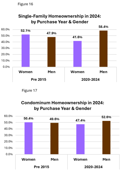 Although men are the primary buyers of homes in the District each year, Figures 16 and 17 reveal that in 2024, most homes bought before 2015 are now owned by women. Specifically, Figure 17 shows that men made up 58.4 percent of single-family home purchases from 2020 to 2024. However, for single-family homes bought before 2015 and still owned in 2024, women held 52.1 percent of the ownership. A similar pattern appears in the condo market, where men purchased 52.6 percent of condos between 2020 and 2024, but women owned 50.4 percent of those bought before 2015. These trends suggest women are more likely to keep their homes long-term, while men may be more inclined to sell within ten years. Additionally, these figures imply that a significant share of long-term household wealth among DC homeowners is probably held by women.