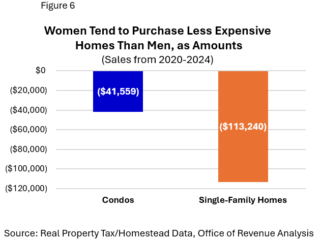 In 2024, DC’s housing market ranked among the most expensive in the U.S., with a median sale price of $655,000 compared to the national median of $420,300. Still, half of all homes sold in the city that year were also purchased for $655,000 or less. Women homebuyers in the District earn about 30 percent less on average than men homebuyers, according to Home Mortgage Disclosure Act data. Reflecting this income gap, Figure 6 shows that, between 2020 and 2024, women paid an average of $41,559 (7.3 percent) less than men for condominiums and $113,240 (11.4 percent) less for single-family homes.