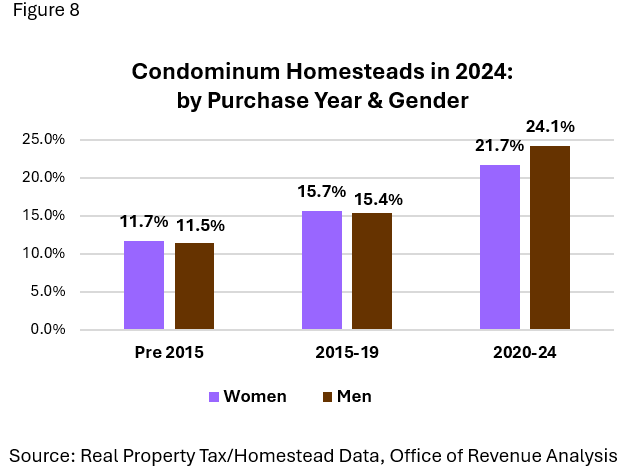 In the District, about 35 percent of single-family homes sold in 2024 had last been purchased either between 2020 and 2024 or before 2015. Women homebuyers were more prevalent before 2015, while men dominated recent purchases (Figure 7). Condominium homes have grown in popularity across genders. Although earlier years saw a slightly higher proportion of female condo buyers (Figure 8).