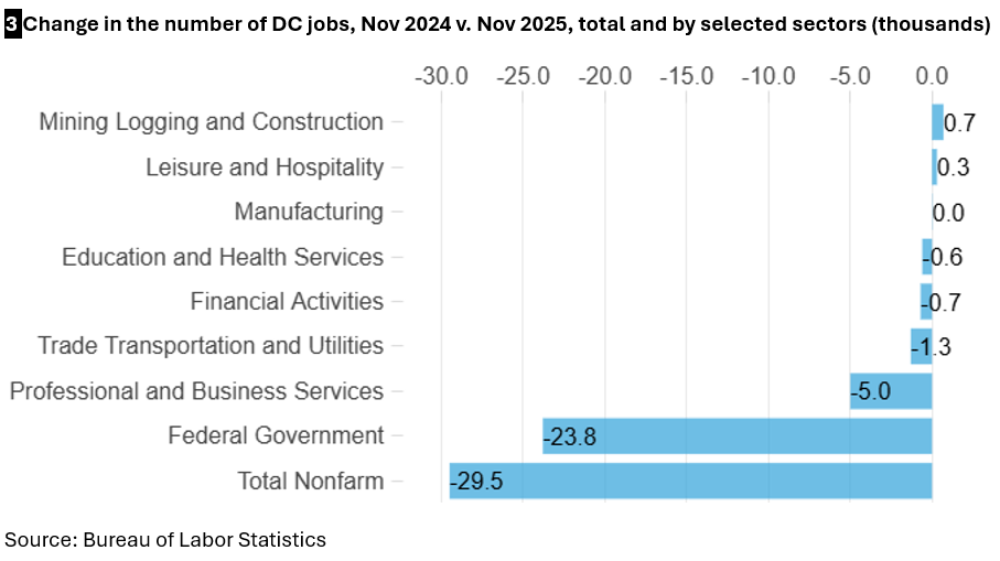 Table 1 and Chart 3 show job losses by sector over the past year. District job growth had slowed to a trickle even before the current administration’s aggressive cuts to federal jobs. The trend became more pronounced at the start of 2025, driven by the administration’s Department of Government Efficiency and other federal actions to reduce the size of the federal workforce. District job losses accelerated in October, when the Deferred Resignation Program, under which thousands of federal workers agreed to voluntary separation, took effect. Jobs in other District sectors, such as Professional and Business Services, Leisure and Hospitality, and Health and Education, also declined or posted only slight gains over the past year. This is evidence of a broader economic slowdown in the District, as federal workforce cuts and other federal policies constrain growth.
