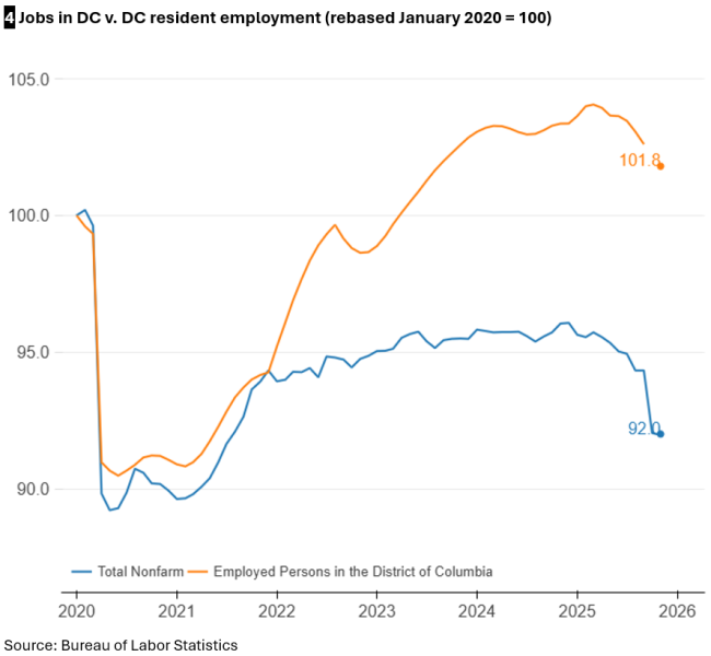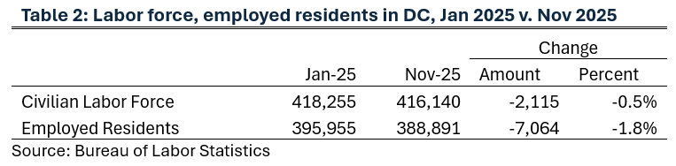 On Jan. 7, 2026, the Bureau of Labor Statistics released the state employment data for October and November 2025, which had been delayed by a federal government shutdown. The data showed that the District lost 18,400 jobs between September and October and a further 600 in November. Much of that loss was driven by federal job losses (15,300) resulting from the Deferred Resignation Program, announced earlier in 2025 as part of the federal government’s efforts to reduce the federal workforce. Between September and October, 1,300 jobs were lost in the Professional Business Services sector, where most jobs are held by federal government contractors, followed by an additional 700 in November. The steep job losses since September leave jobs in the District at 739,200, a level not seen since the year following the lows of the COVID-19 pandemic.